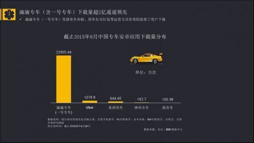 报告显示,截止到2015年6月中国专车安卓应用市场,滴滴打车(含一号专车)安卓应用市场的下载量为22905.44万次,Uber、易到用车、神州专车等专车应用,分别以1078.8万次、644.45万次、162.7万次分列行业二、三、四位。