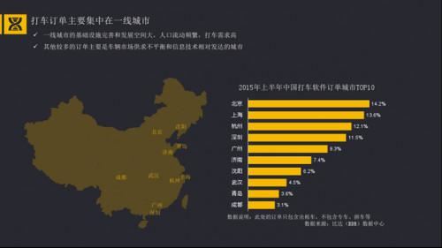 随着移动出行市场的发展,打车软件这个新生事物也逐渐成为人们出行选择之一。据报告显示,2015年审行半年中国打车软件订单城市TOP10分别是北京(14.2%)、上海(13.6%)、杭州(12.1%)、深圳(11.5%)、广州(9.3%)、济南(7.4%)、沈阳(6.2%)、武汉(4.5%)、青岛(3.6%)、成都(3.1%)。