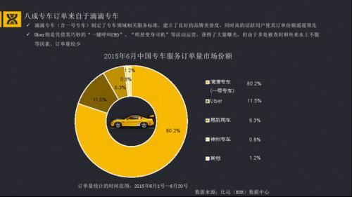 近日,中国IT研究中心(CNIT)正式发布《2015年中国移动出行应用市场研究报告》。据报告显示,截止到2015年6月,滴滴专车(含一号专车)占据中国专车服务订单量市场份额的80.2%。,第二名Uber的服务订单量占市场份额的11.5%。